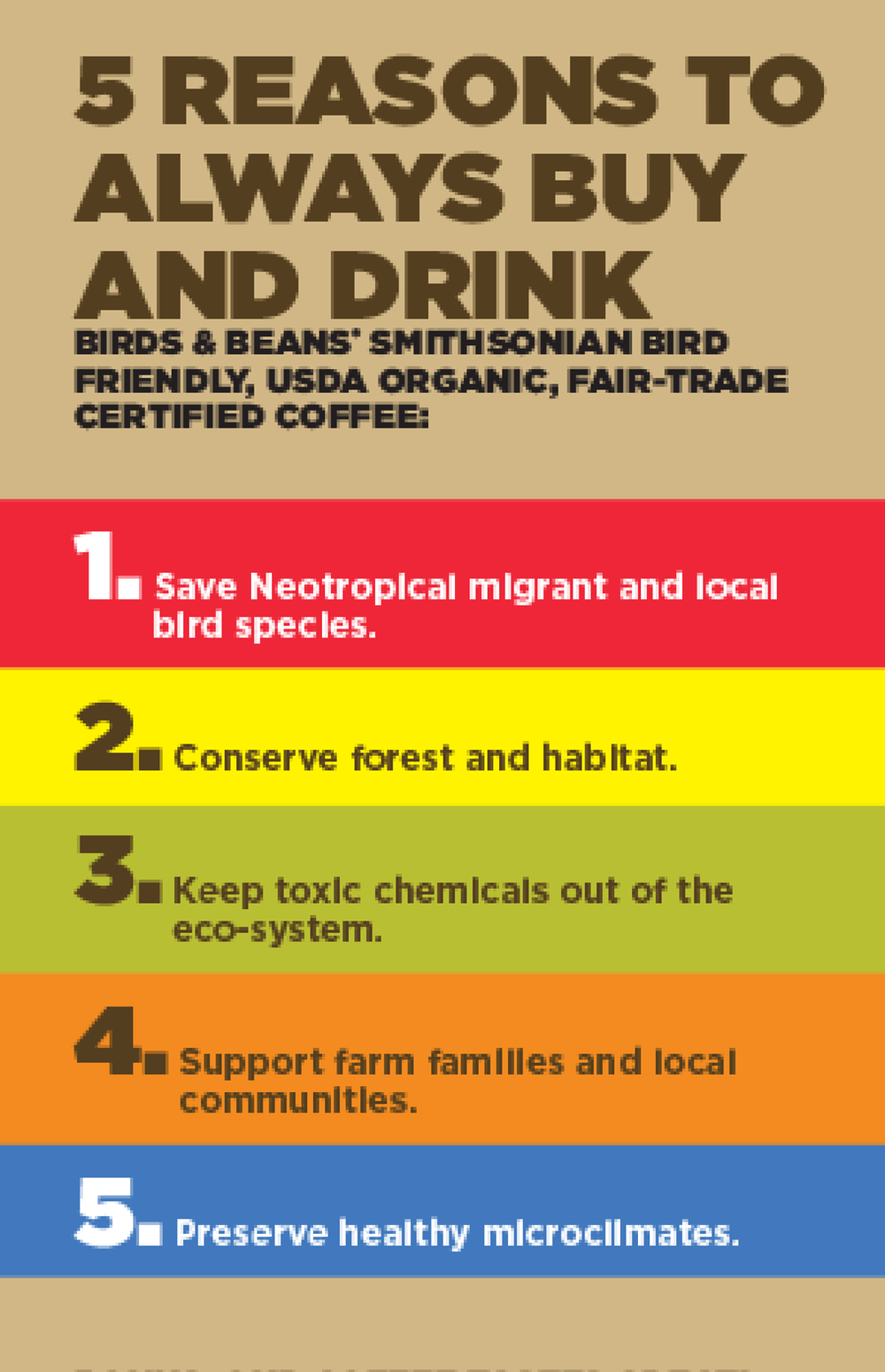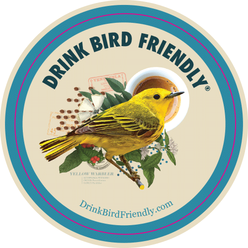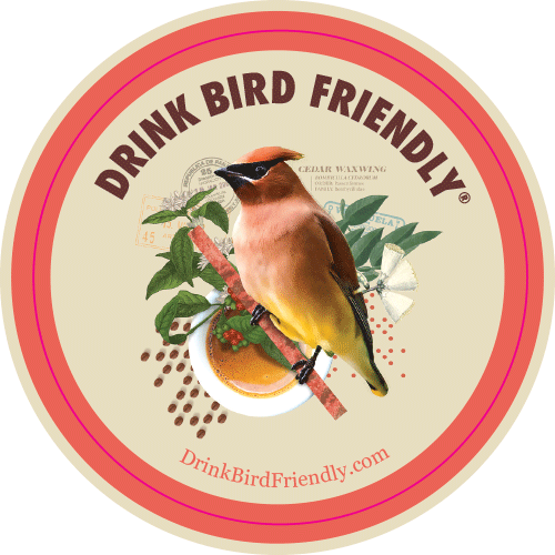 Birds & Beans coffees are certified as bird-friendly by the Smithsonian Migratory Bird Center. Birds & Beans is, in fact, the only coffee that is Organic, Fair Trade and Certified Shade Grown! That means that not only are the beans grown without pesticides or herbicides, and by workers who are fairly compensated, but NO rain forests have been destroyed. This coffee is not grown in the understory of a previously cut rain forest. Rain forests are a critical habitat for migratory song birds. No Habitat. No Songbirds.